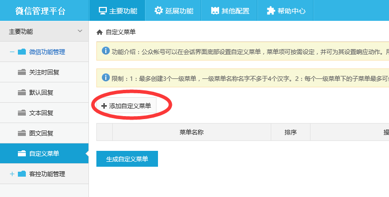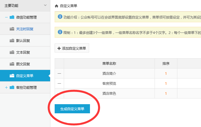 注意:最多创建3个一级菜单,一级菜单名称名字不多于4个汉字。2:每个一级菜单下的子菜单最多可创建5个,子菜单名称名字不多于4个汉字。
