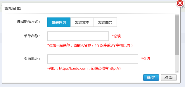 点击【添加自定义菜单】按钮 有三种模式选择【跳转网页】【文本信息】【图文信息】选择相应模式 内容都是必填。